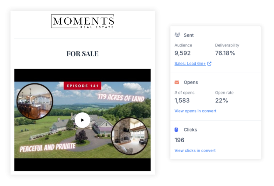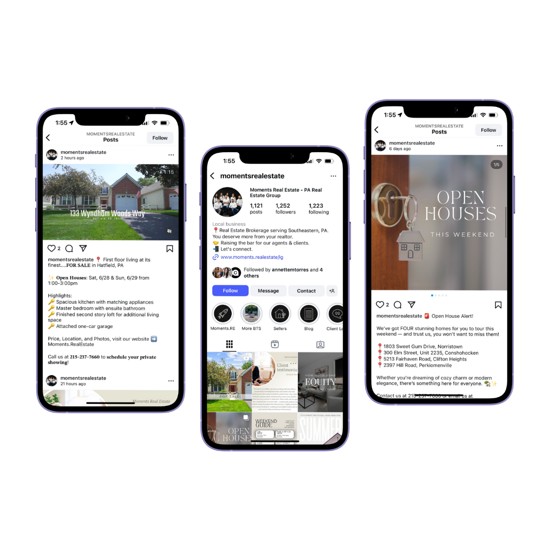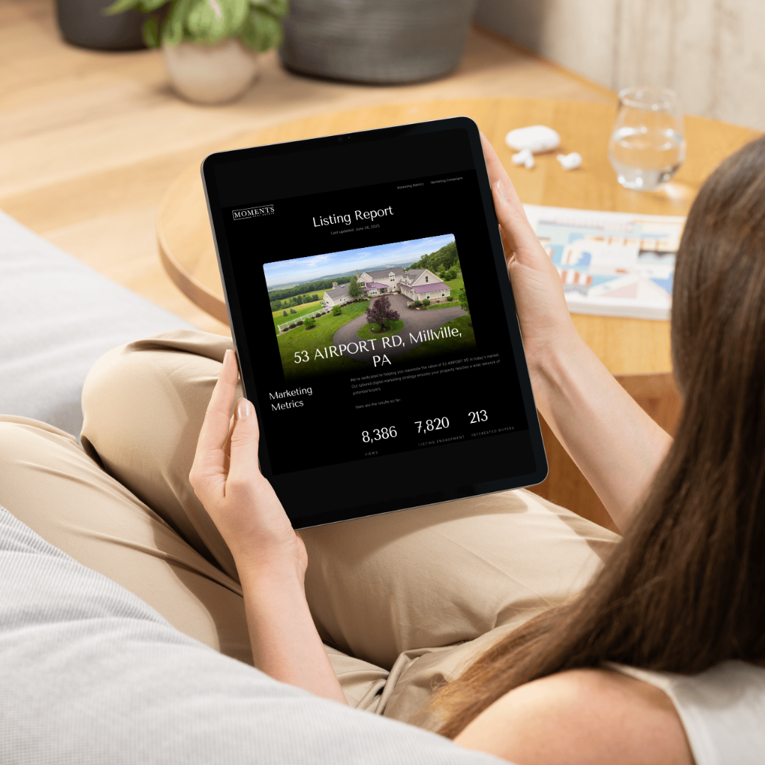 - [](https://www.instagram.com/momentsrealestate/) [OUR LISTING PLAN](https://prezi.com/view/2cZ6405f4K0WkQ3UeF7P/) [GET YOUR HOME'S VALUE](https://www.moments.realestate/sellers) **STUNNING ONLINE PRESENTATION**.png) **STRATEGIC SOCIAL MEDIA MARKETING**.png) **CUSTOM EMAIL CAMPAIGNS**.png) **IMPECCABLE LEAD FOLLOW UP**.png) **DETAILED SELLER REPORTS**.png) ### Staging _matters_. Home staging goes beyond just cleaning and decorating your home, it involves strategic planning on how to showcase your home's best features in order to increase the amount buyers will be willing to pay. [Our professional staging consultant](https://www.moments.realestate/home-staging) will work with you to ensure your home is set up for success. From in-person consultations to bringing in furniture to virtual staging services, we will provide whatever your home needs.  ### 82% Of buyers' agents said staging a home made it easier for a buyer to visualize the property as a future home. ### 47% Of real estate agents claim that home staging had an effect on most buyers' view of the home. ### 73% A professionally staged home spends 73% less time on the market compared to those without staging. ### 25% Staged homes on the market sold for 25% more than homes without staging. #### PROFESSIONAL PHOTOGRAPHY ### Capture your home's _beauty._ The first time potential buyers see your home will almost always be through photos online. High-quality, strategic photography will make your home stand out and bring the best buyers to your door. Image quality, lighting, room angles, framing, and more are all crucial to setting your home apart from the rest. Our team has done the research to find [a professional who has risen to the top of this industry](https://www.moments.realestate/professional-photography) and meets all of these qualifications and more. ### Aerial Drone [Read more](https://www.moments.realestate/professional-photography) ### Optimal Lighting [Read more](https://www.moments.realestate/professional-photography) ### Crisp Quality [Read more](https://www.moments.realestate/professional-photography) ### Strategic Angles [Read more](https://www.moments.realestate/professional-photography) #### VIDEO MARKETING ### Tell your home's _story_. Tug on potential buyers' heartstrings with a compelling video showcasing your home's story. Emotional connection is one of the most powerful motivators. ### 51% Of home buyers use YouTube as their number one destination for a search. ### 58% Of buyers want and expect to see video of a home they’re looking at online. ### 38% According to Facebook, video is 38% more effective than images. ### 39% Of buyers used real estate websites with embedded video during their home search. Stunning Home For Sale in Millville, PA - YouTube [](https://www.youtube.com/channel/UCkiS9_nSaBMkOC3MkDx1tFg?embeds_referring_euri=https%3A%2F%2Fwww.moments.realestate%2F) Moments.RealEstate 216 subscribers [Stunning Home For Sale in Millville, PA](https://www.youtube.com/watch?v=2nVrEk1R1kQ) [](https://www.youtube.com/embed/2nVrEk1R1kQ?wmode=transparent&showinfo=0&rel=0) Moments.RealEstate Search Watch later Share Copy link Info Shopping Tap to unmute If playback doesn't begin shortly, try restarting your device. More videos ## More videos You're signed out Videos you watch may be added to the TV's watch history and influence TV recommendations. To avoid this, cancel and sign in to YouTube on your computer. CancelConfirm Share Include playlist An error occurred while retrieving sharing information. Please try again later. [ Watch on ](https://www.youtube.com/watch?v=2nVrEk1R1kQ&embeds_referring_euri=https%3A%2F%2Fwww.moments.realestate%2F) 0:00 0:00 / 0:31 •Live • [](https://www.youtube.com/watch?v=2nVrEk1R1kQ) #### 3D TOURS ### A unique _virtual tour_. Our interactive virtual tour software offers potential buyers the ability to walk through an accurate 3D rendering of your home without having to leave their living room. Through cutting-edge technology, they can zoom in and out of the space, view the floor plan, measure any part of the home, and walk through as if they were physically there. 18 Grebe Rd # 18 Grebe Rd Explore 3D Space ## Presented by Powered by  ### Stand out _online__._ We will point potential buyers to a cutting-edge, customized web page featuring beautiful photos, video, and key information about your home, as well as access to the 3D virtual tour & more! This page is specially designed to capture potential buyers' information so that our Realtor partners can follow up with each and every one. Your home will also be featured on all major home search websites like Zillow, Realtor.com, Trulia, Redfin, and more. When high intent buyers are searching for homes, this is where they will be looking. .png?w=851) ### Reach Thousands on _Social Media__._ Our team will create a custom social media marketing campaign designed to get thousands of eyes on your home online and drive traffic to your home's website and Open Houses. Through a series of specially designed posts and paid advertisements across _Facebook, Instagram, LinkedIn, Youtube, and more_ we strategically build anticipation so that the moment your home becomes available interested buyers are "waiting at the door". Our listing ads have reached over 32 thousand people at one time and every comment and message gets timely attention from our team. [Follow Us On Instagram](https://www.instagram.com/momentsrealestate/) [Like Us On Facebook](https://www.facebook.com/MomentsRealEstate) .png?w=851) ### Custom _Email Campaigns_. Using our top-of-the-line email software, we target numerous potential buyers within our database of nearly 20k. We track past communication, email interaction, website activity, and more in order to pinpoint everyone in our database who may have an interest in your home. We then craft a series of thoughtfully designed emails that we utilize for retargeting marketing to promote your home's best features, website, and open